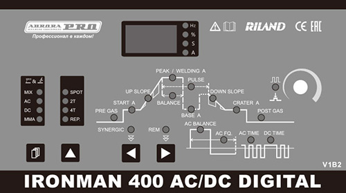 IRONMAN 400 AC/DC DIGITAL - один из самых мощных аппаратов в линейке AuroraPRO для профессиональной аргонодуговой сварки постоянным и переменным током TIG AC/DC и для полноценной сварки штучным плавящимся электродом MMA. На удобной, понятной любому сварщику циклограмме отдельно настраивается режим ПУЛЬС и регулируется каждая стадия сварочного процесса для выполнения максимально разнообразного круга сварочных задач. Широкий диапазон регулировки сварочного тока и достойное значение ПН инвертора делают аппарат универсальным и незаменимым на производстве. АЙРОНМЭН 400 AC/DC ДИДЖИТАЛ отлично выполняет работу любого уровня сложности в процессе сварки алюминия, равно как и всех черных и цветных металлов. Усиленный блок инновационной инверторной технологии IGBT гарантирует надежность работы данной техники на долгие годы.