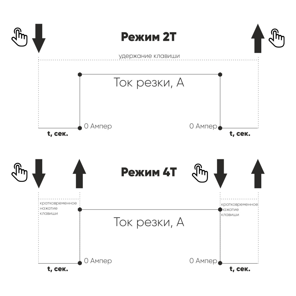 - Режим 4T облегчает длительные резы, при кратковременно нажатии и отпускании клавиши плазматрона начинается процесс резки, в дальнейшем при повторном кратковременном нажатии и отпускании клавиши на плазматроне процесс резки заканчивается.