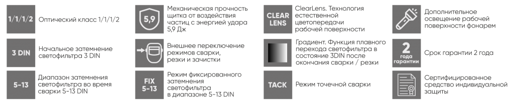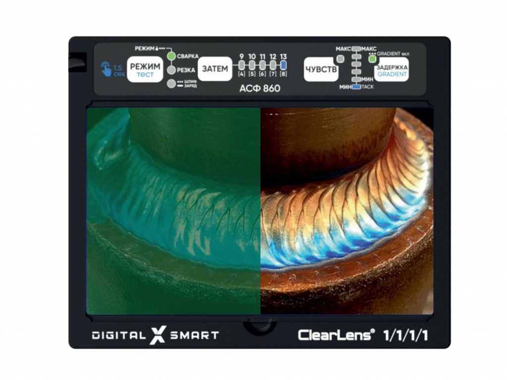 Технология ClearLens - обеспечивается более естественная цветопередача светофильтра, как в незатемненном состоянии, так и во время сварки. Широкий диапазон различаемых цветов и оттенков позволяет сформировать более объективное представление о свариваемой поверхности. Таким образом реалистичное восприятие повышает комфорт и позволяет максимально сосредоточиться на выполнении поставленных задач ;