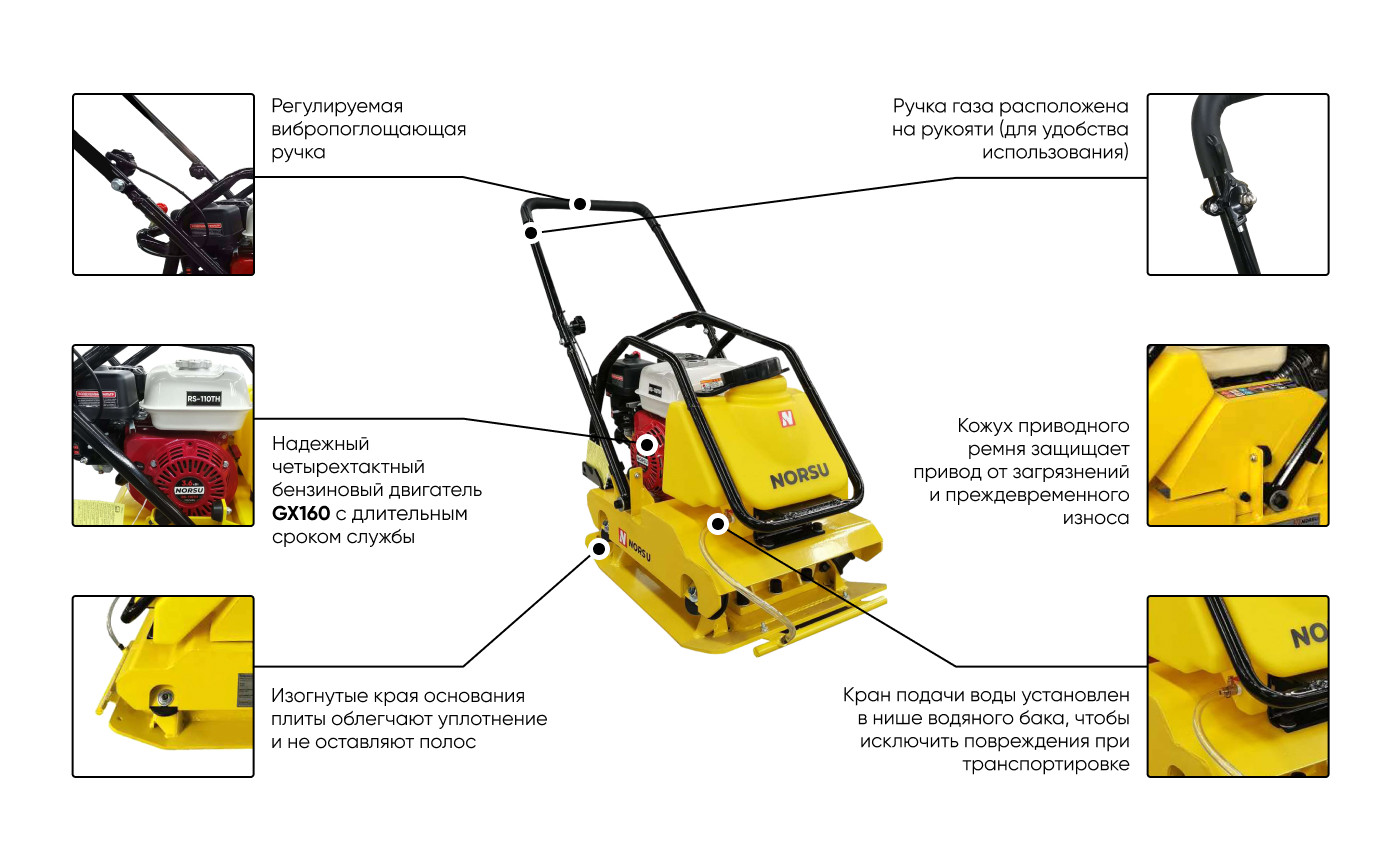 NORSU RF-110TH отлично зарекомендовала себя в работе с песчаным, гравийным основаниями, связными грунтами, подходит для работы в углах, ограниченном пространстве. Встроенные колеса позволяют быстро перемещать ее с одного рабочего участка на другой, минимизируя перерывы в работе.