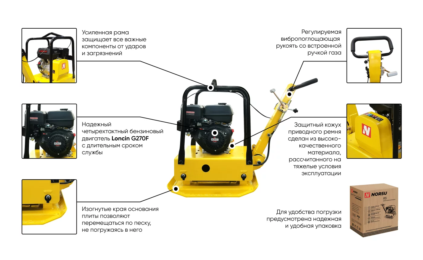 Реверсивная виброплита NORSU RS-R170L может выступать доступной альтернативой или дополнением к виброкаткам. Обладает максимальным уплотняющим усилием и высокой маневренностью, используется при уплотнении всех разновидностей связных и сыпучих грунтов: песка, щебня, песчано-гравийных смесей, асфальтобетона. Основное отличие реверсивной плиты от прямоходной — возможность движения не только вперед, но и назад, что существенно уменьшает нагрузку на рабочего, повышает удобство эксплуатации плиты в стесненном пространстве.