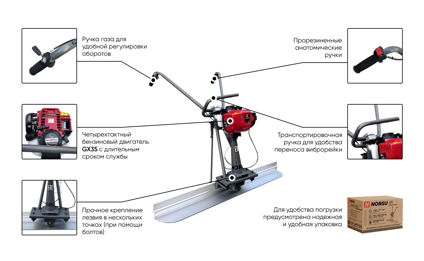 Бензиновая виброрейка NORSU VR-80H с надежным двигателем HONDA GX35 позволяет быстро и равномерно укладывать бетон. Отличается прочностью, компактностью, маневренностью, небольшим собственным весом — 15.4 кг. Эргономичная конструкция обеспечивает равномерное распределение вибрации по всей поверхности лезвия, позволяет удобно держать инструмент в руках и маневрировать им без усилий. Опорная ножка на раме надежно защищает элементы управления от загрязнений во время остановки. Объем топливного бака в данной модели составляет 0.63 л.